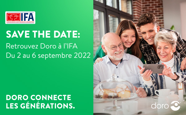 Du 02 au 06 septembre 2022, l'IFA se déroulera en direct à Berlin - et notre équipe Doro sera au cœur de l'événement. En tant que constructeurs de produits et solutions à destination des seniors, nous sommes impatients de vous accueillir sur notre stand dans le hall 4.2, n°306.